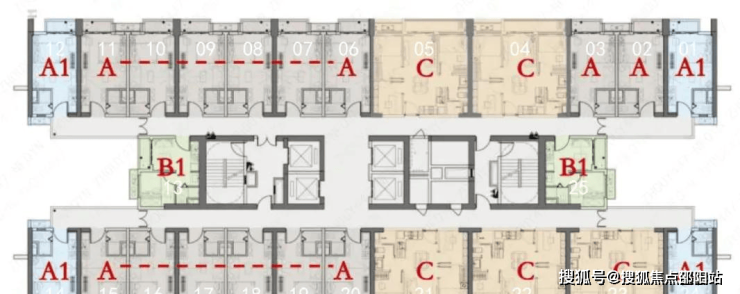 ◎标准层平面图:A/A1户型为约35㎡单房;B1户型为约35㎡1房1厅;C户型为约69㎡2房。售楼处电话:400-166-9557。