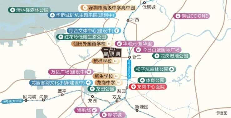 步行约600米地铁3号线东延线新生站(预计2025年通车),与地铁21号线(规划中)交汇,未来2站换乘深惠城际(前海至龙岗段已动工),7站深圳北、11站速达前海。