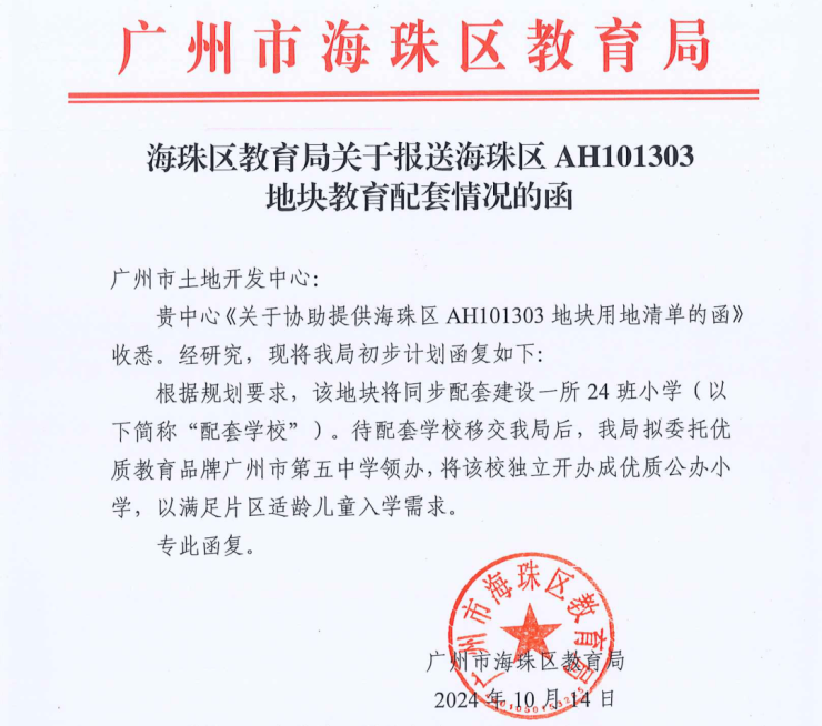 按照此前规划,项目西侧是要配建24班小学的。而且,早在去年10月份,海珠区教育局就已经公示,配建学校将委托广州市第五中学领办,届时会将该校独立开办成优质办公小学。