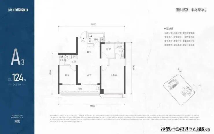 A3也是两条腿,分别是1-1栋04/05,主朝向是东南向,双龙抱珠格局。客厅拥有超大观景阳台,缺点是公卫是个暗卫,小次卧和主卫也对天井外走廊,采光不足。