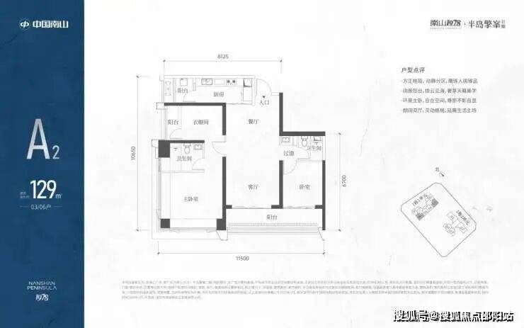 A2有两条腿,分别1-1栋03/06,主朝向是东南向,双龙抱珠格局。这个户型是超阔大阳台,朝向优于A1,但公卫是个暗卫。
