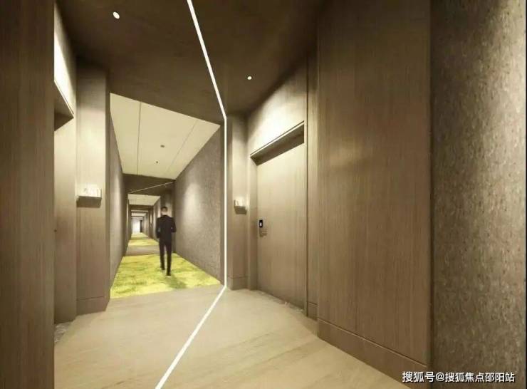 前行至客房區,腳步開始放緩,連續的木質套盒裝置被植入長條形的客房走道,每個木質套盒在房間入口處停駐,為每位賓客提供了自己獨有的前廳。木質套盒中央銳利的方形發光帶不僅分隔了各自的前廳,也為前行的賓客提供一種隱性的空間指引。