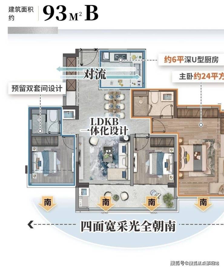 更何况这是在100平以下产品当中,极为少见的客餐厅南北对流设计。再搭配深U型厨房+约6.3米大尺度景观阳台,形成LDKB公区。