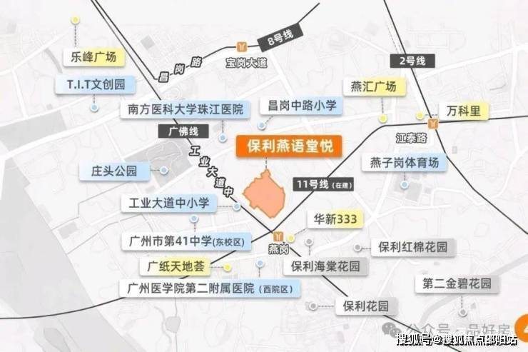 ———— 基础信息 ————【项目地址】广州海珠·工业大道中·燕岗站地铁口约50m处【项目规模】总占地约2.6万㎡,总建面约11.79万㎡【项目户型】建面约90-125㎡改善雅宅可售住宅共7栋