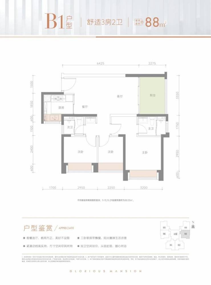 建面约88㎡舒适3房2卫