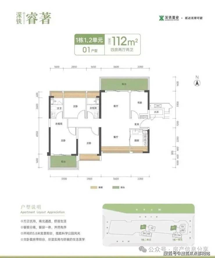 112㎡的4房2厅2卫,1栋1/2单元01户型,设计的是竖厅南北通透格局,进门入户玄关,客厅3.6米开间,实测高达23.88㎡餐客分离,餐厨一体设计,四开间朝南,主卧套房带阳台,4个卧室分别做到了主卧17.21㎡/次卧9.55㎡/次卧8.1㎡/次卧5.72㎡(实测面积,去掉墙体),客厅连接次卧出9.28㎡的巨幕大阳台,U型厨房,卫生间干湿分离,得房率约:80%(不含赠送),阳台主朝东北向看科学公园。套内面积89.6㎡+赠送面积16.1㎡=实用面积105.7㎡,加上赠送后得房率约94.37%。