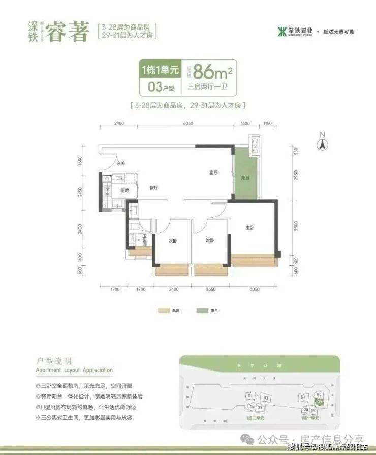 86㎡的3房2厅1卫,1栋1单元03户型,设计的是竖厅格局,客厅3.5米开间,LDKB一体化设计,进深10.05米,主卧全朝南,动静分区,3个卧室分别做到了主卧11.67㎡/次卧8.64㎡/次卧8.46㎡(包含飘窗),U型厨房,卫生间三段式分离,得房率约:80%(不含赠送),阳台5.5㎡东南朝向。套内面积68.8㎡+赠送面积8.5㎡=实用面积77.3㎡,加上赠送后得房率约89.88%。