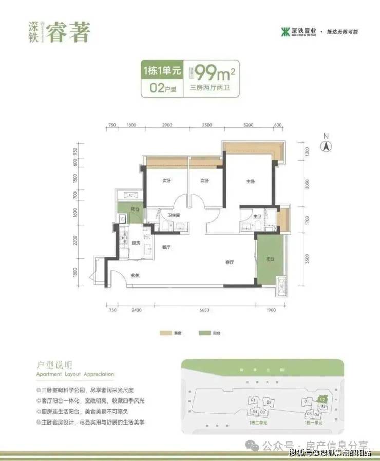 99㎡的3房2厅2卫,1栋1单元02户型,设计的是竖厅格局,客厅3.5米开间,LDKB一体化设计,进深11.7米,动静分区,三卧室朝东北向看科学公园,3个卧室分别做到了主卧18.06㎡/次卧9.57㎡/次卧7.59㎡(包含飘窗),二字型厨房还带1个生活阳台,公卫三段式分离,得房率约:80%(不含赠送),阳台6.55㎡东南朝向。套内面积79.2㎡+赠送面积12.58㎡=实用面积91.78㎡,加上赠送后得房率约92.7%。