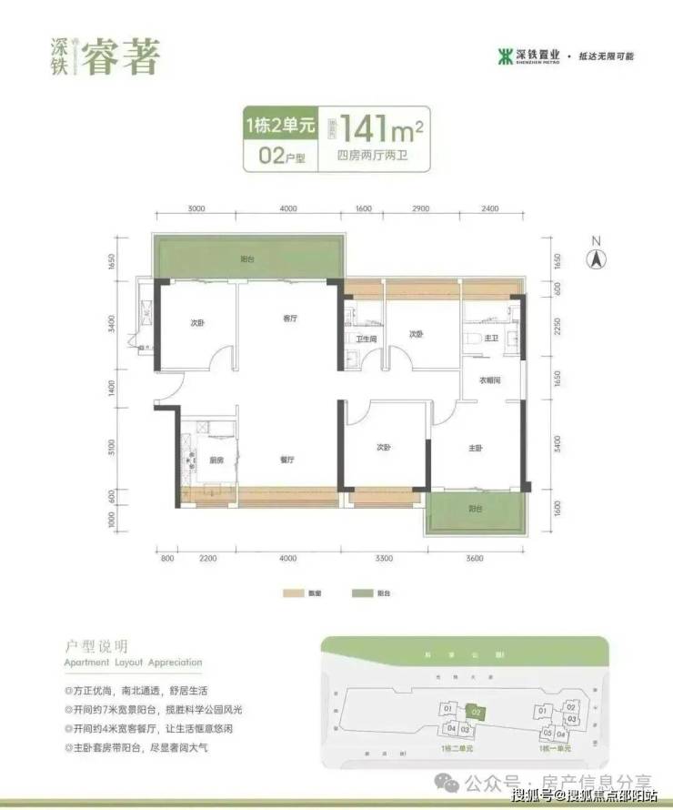 141㎡的4房2厅2卫,1栋2单元02户型,设计的是竖厅南北通透格局,进门入户玄关,客厅4米开间,实测高达31.58㎡方正餐客分离,餐厨一体设计,四开间朝南,主卧套房带阳台,4个卧室分别做到了主卧19.89㎡/次卧11.49㎡/次卧9.3㎡/次卧9.1㎡(实测面积,去掉墙体),客厅连接次卧出11.55㎡的巨幕大阳台,U型厨房,卫生间干湿分离,得房率约:80%(不含赠送),阳台主朝东北向看科学公园。套内面积112.8㎡+赠送面积18.5㎡=实用面积131.3㎡,加上赠送后得房率约93.12%。