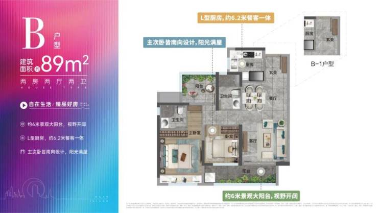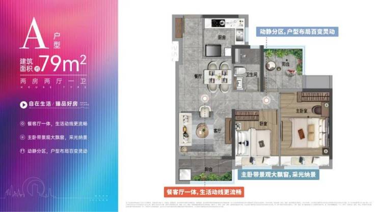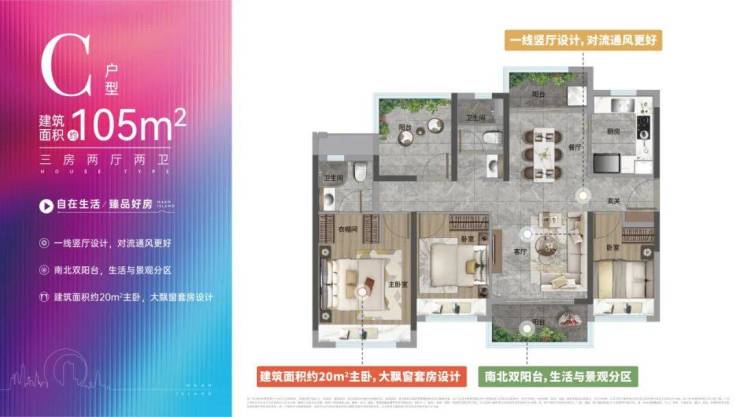 整体双南双北的户型布局,户型东西总进深近14米,南向阳台近6米宽,南北通透,视野开阔。