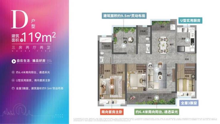 不到百平空间亦可实现轻松满足二孩家庭、三代同堂或居家办公等多元需求。全屋南北通透,空气对流顺畅,阳光洒满每个角落。特别值得一提的是餐厨一体化设计,通过空间联动与厅区扩容,打造出约15㎡超大餐厨空间,居住体验完全不输建筑面积约90平以上的户型。