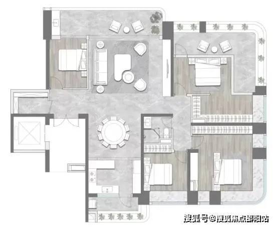 210㎡的四房三卫,270°一线景观,采光面超40米,双套房+270°弧形飘窗设计。