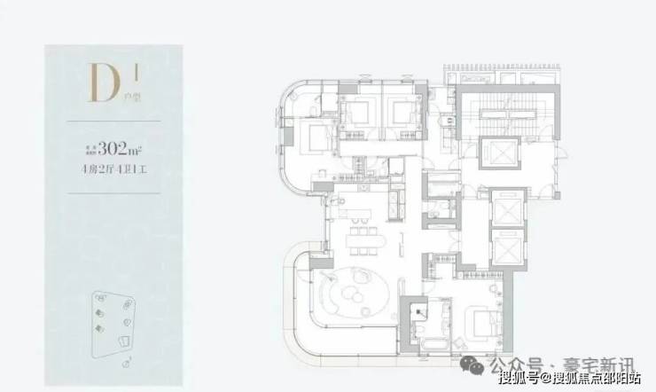 1D栋(1栋四单元)-45层:均为3梯2户,约302㎡,一层两户。