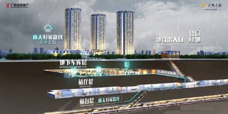 项目与其他TOD项目最大的区别在于:规划了市面上地铁盘所少有的专属归家通道,与地铁站厅无缝衔接;业主通过专属通道抵达地铁站,享受无日晒无风雨出行体验。