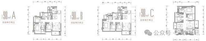 98㎡的户型则做到了4房2卫: