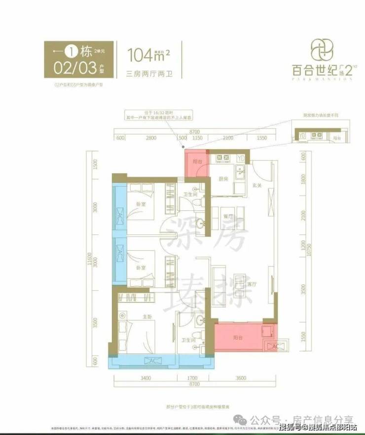 104㎡的3房2厅2卫,1栋02/03户型,设计的是竖厅格局,客厅3.6米开间,LDKB一体化设计,三开间朝南,动静分区,3个卧室分别做到了主卧15.81㎡/次卧10.2㎡/次卧10.2㎡(包含墙体飘窗),L型厨房带1个生活阳台,公卫三段式干湿分离,得房率约76.9%(不含赠送),正南朝向。套内面积79.76㎡+赠送10.31㎡=实得90.07㎡,加上赠送得房率约86.8%。