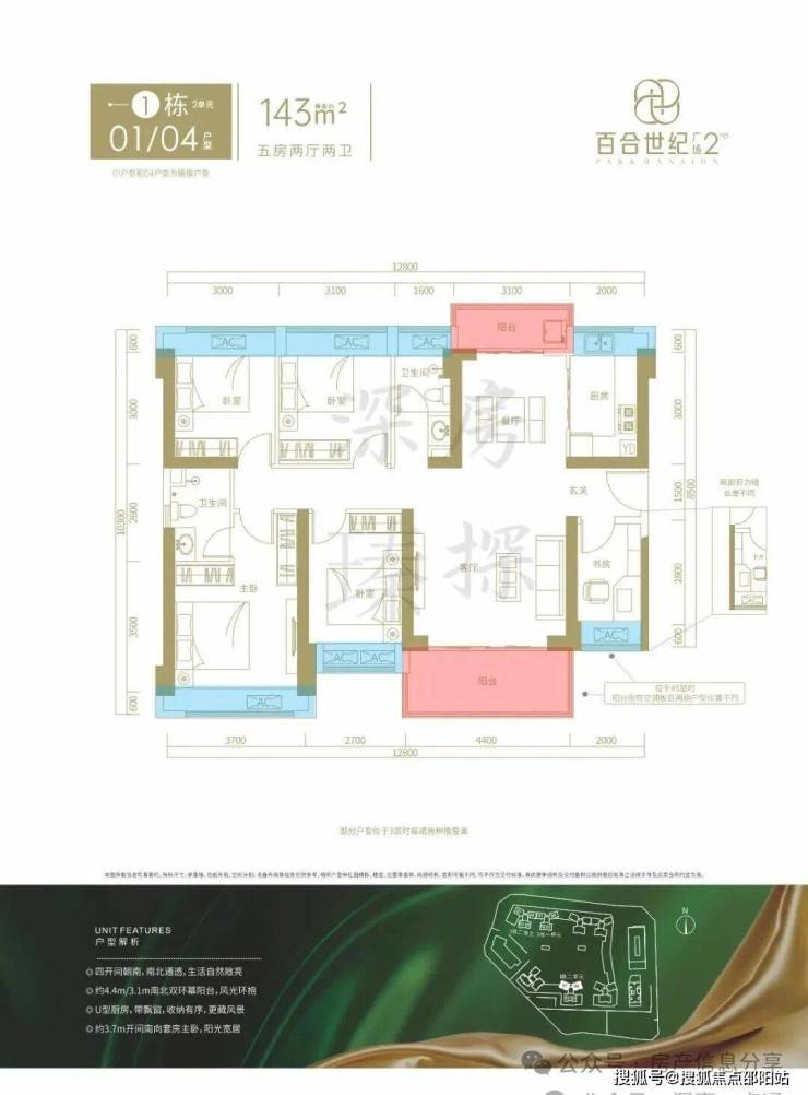 143㎡的5房2厅2卫,3栋1单元04/3栋2单元01户型,设计的是竖厅南北通透格局,进门入户玄关,客厅4.4米开间,客餐厅分离设计,南北双阳台,四开间朝南,4个卧室分别做到了主卧17.77㎡/次卧11.16㎡/次卧10.8㎡/次卧10.8㎡/次卧6.8㎡(包含墙体飘窗),U型厨房,卫生间干湿分离,得房率约76.9%(不含赠送),阳台主朝西南或东南向。套内面积109.52㎡+赠送17.22㎡=实得126.74㎡,加上赠送得房率约88.94%。