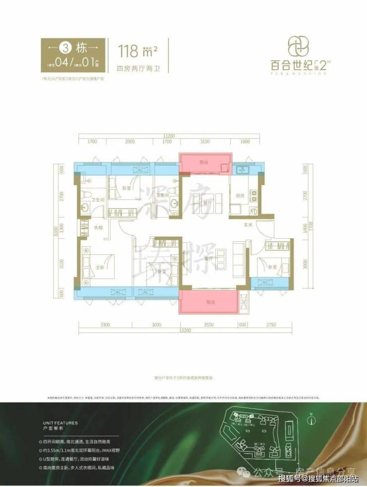 118㎡的4房2厅2卫,3栋1单元04/3栋2单元01户型,设计的是竖厅南北通透格局,进门入户玄关,客厅4.15米开间,客餐厅分离设计,南北双阳台,四开间朝南,4个卧室分别做到了主卧16.5㎡/次卧11.1㎡/次卧9.57㎡/次卧8.25㎡(包含墙体飘窗),U型厨房,卫生间干湿分离,得房率约76.2%(不含赠送),阳台主朝西南或东南向。套内面积89.55㎡+赠送15.44㎡=104.99㎡,加上赠送得房率约89.37%。