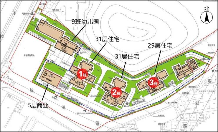 1-2栋,31层洋房,两梯六户,南北通透,南向户型采光良好,北向则略逊一筹,楼栋靠近坑田路,低层易受车行噪声、灰尘影响。