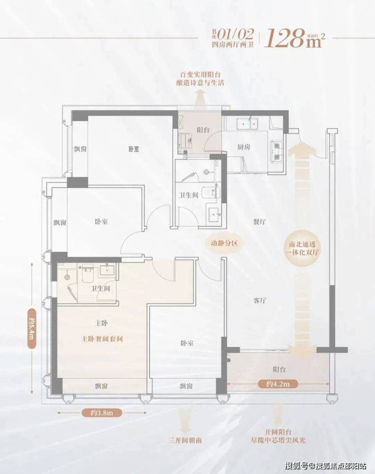 天宸128㎡户型图,双卫浴、双阳台设计,主卧大套房,空间开阔。