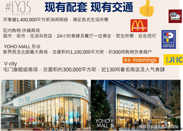 周边配套:项目附近有购物中心满足生活所需,同时拥有两家大型商场YOHO MALL形点,总面积约110万平方呎和V city面积约30万平方呎,构成消费网络满足各式生活所需。