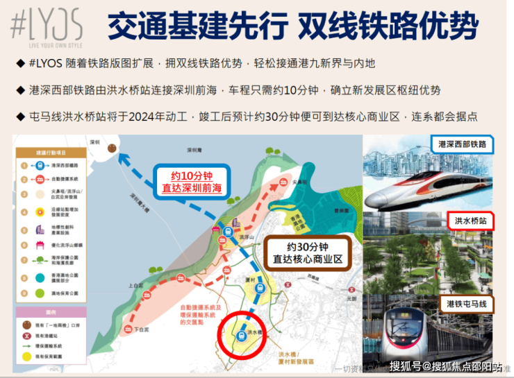 交通方面:随着铁路版图扩展,拥双线铁路优势,轻松接通港九新界与内地,港深西部铁路由洪水桥站连接深圳前海,车程只需约10分钟,确立新发展区枢纽优势,屯马线洪水桥站将于2024 年动工,竣工后预计约30分钟便可到达核心商业区。