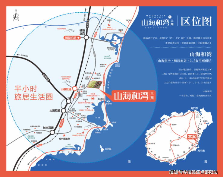 山海和湾位于海南省万宁市山根镇,属于博鳌亚洲论坛规划区,占据博鳌南大门的咽喉位置。距离博鳌机场仅18公里,我们的项目是位于海口和三亚的中心的位置,距海口仅116公里,距三亚仅118公里,乘坐东环轻轨仅50分钟的车程。无论您是去海口购物还是去三亚旅游,都在一个小时的生活圈内。