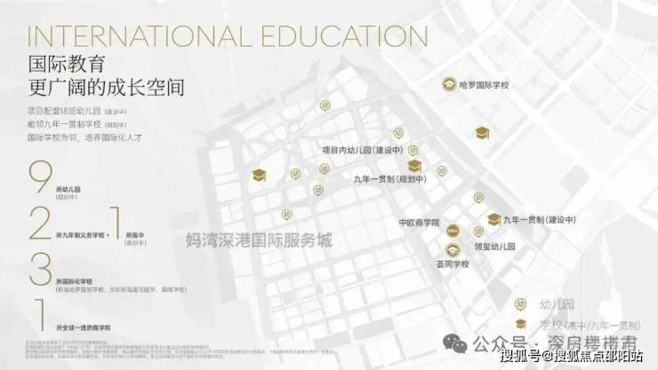 项目周边拥有15所幼儿园、4所义务教育学校,还有荔湾小学和深大附中等学校都在周边。此外项目靠近多所国际学校,拥有3000到5000个名额,包括荟同国际学校、礼德国际学校、英国国王学校(深圳分校)以及深圳哈罗国际学校。临近小区南侧有一块九年制教育用地,但目前未招标。入住早期可能要到妈湾南二外学校或者前湾南二外学校上学。