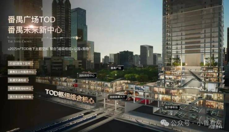 番禺未来新中心:番禺广场板块被定位为番禺区公共服务中心和轨道交通枢纽,打造为以交通枢纽、行政办公、文化休闲、商业商务等功能为主导的番禺未来新中心。番禺广场地下规划5层约18万㎡空间,对标花城广场打造“地下商业+地上公园”发展模式,未来承载千万级客流。