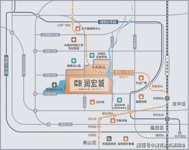 华润润宏城坐落于光明区凤凰街道塘尾社区,地处光明大道与东长路交汇处西北侧,邻近13号线(在建)“月亮路站”,北部接壤东周路,是13号线月亮路站TOD大城,由华润置地与宏发集团联合开发。项目整体规划约382.5万㎡超大体量,打造集轨道交通、优质教育、城市公园、创新产业、品质居住于一体的“宜居、宜业、宜游”都市生态标杆大城。