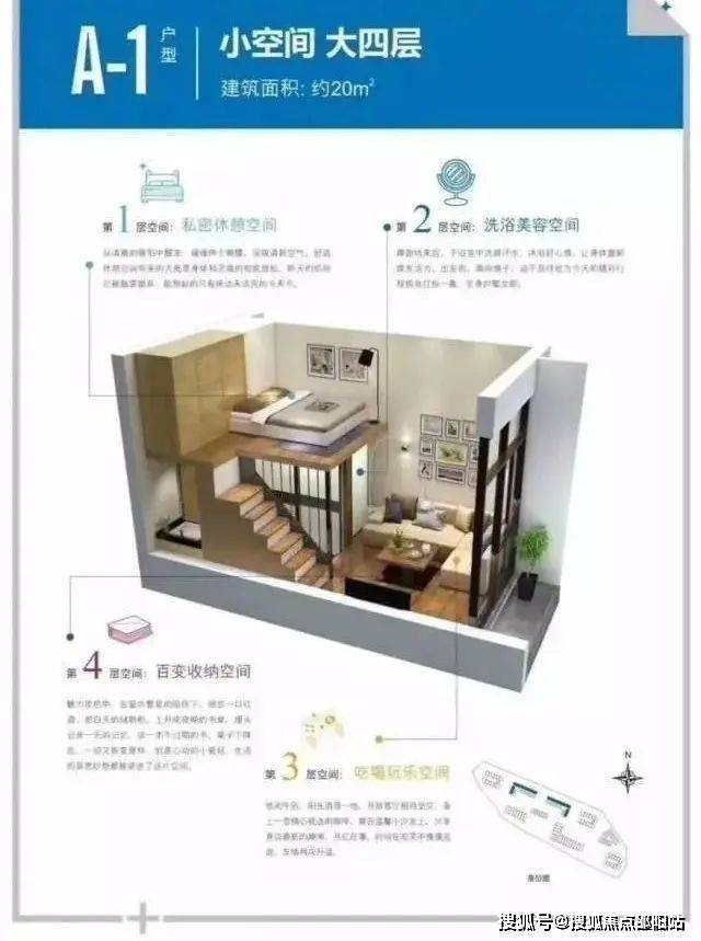 A-1户型品鉴:3.6米层高,单面采光,上下分层布局合理,收纳、起居、空间相对独立。较高的采光高度,足以满足室内自然光线的明亮,小阳台也可完全满足日常外界接触空间和晾晒的需求。