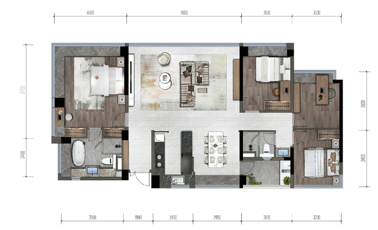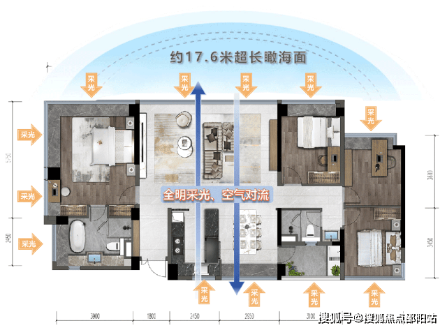 4房2厅2卫,五开间全明设计,整个户型拥有约17.6米超大面宽、12大采光面,享受“类板楼”的居住体验。