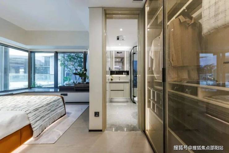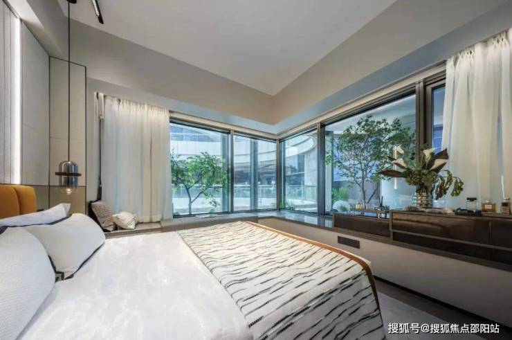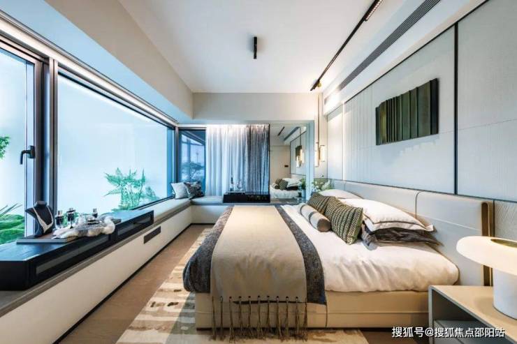 主卧大套房也是一大亮点,面积高达近20㎡,“边厅式”270°大飘窗设计,看山景的视野,升级成了超广角镜头。