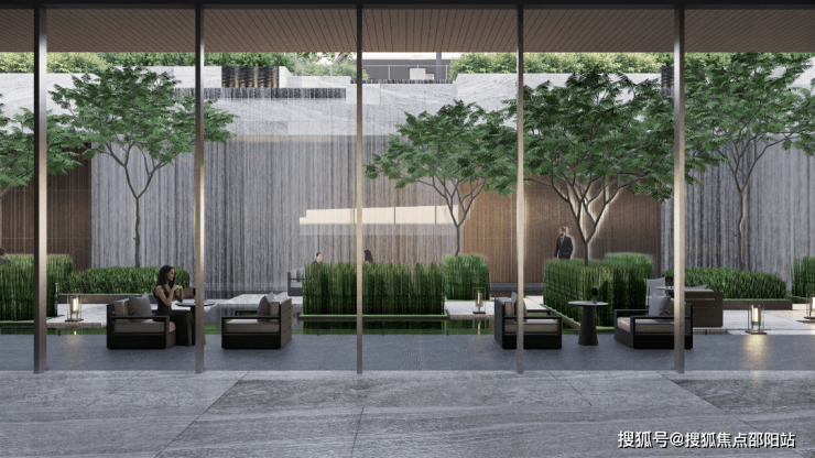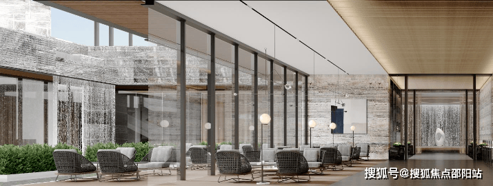 地下车库入户大堂前车马厅设计,借鉴了“港式归家”的理念,一般多在香港高端酒店采用,作为归家的第二道门,既温馨明亮,又超具昭示性。酒店式归家大堂与定制化下沉会所相结合,在负一层引入瀑布景观,整个景观体系更加立体。