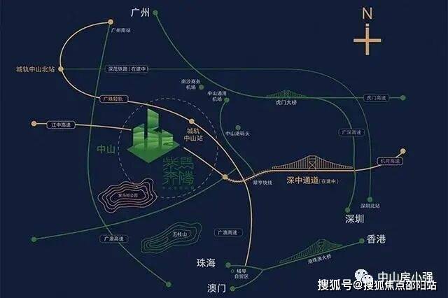 也位于粤港澳大湾区几 何中心,对接博爱路、105 道、广澳高速、中江高速、中开高速、靠近广珠轻轨中山站等多项交通网路,快速到达港澳、广州、 深圳、珠海等大湾区城市,实现 1 小时湾区经济圈。