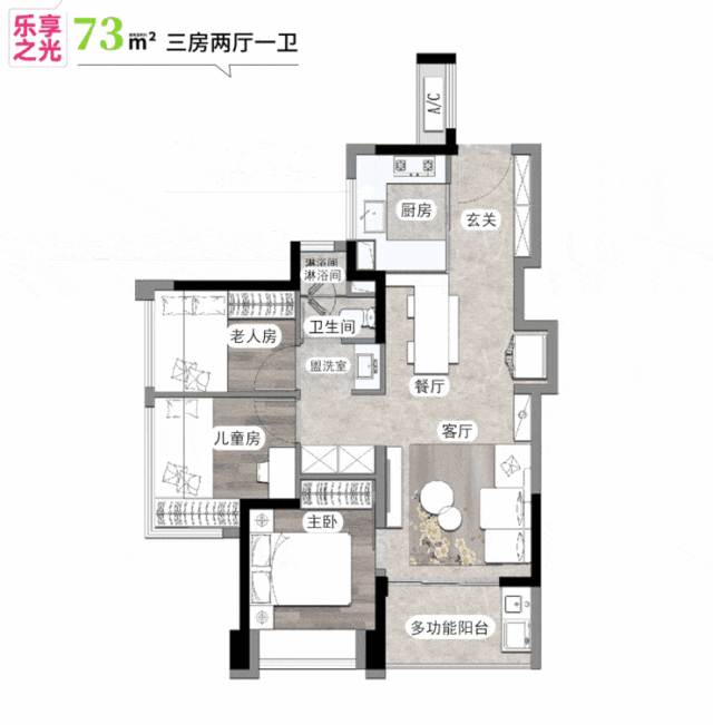 建面约73㎡的三房户型为例,实用率超过80%,整体设计紧凑但不拥挤,动线合理,采光充足。