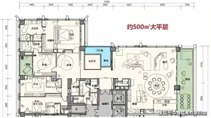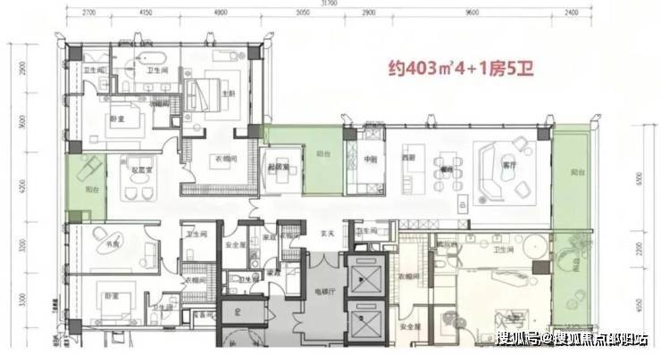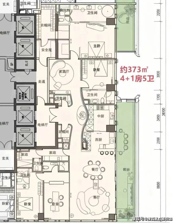 空间配置:4+1房五卫,家庭厅+家政套间,独立电梯厅入户