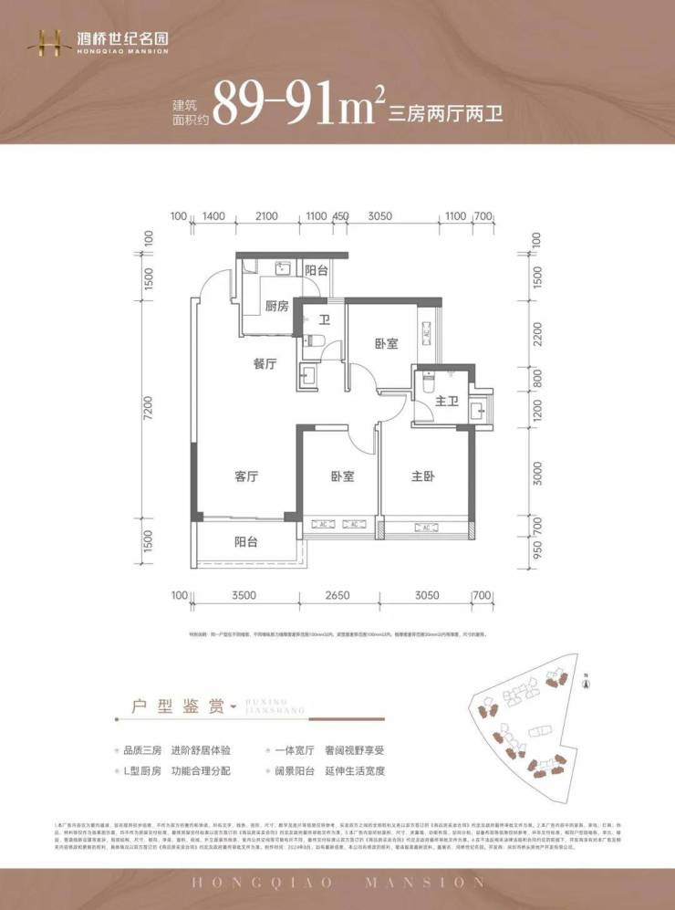 89㎡的3房2厅2卫,设计的是经典竖厅格局,客厅3.5米开间,LDKB一体化设计,3个卧室分别做到了主卧11.28㎡/次卧9.86㎡/次卧9.8㎡(包含墙体飘窗),L型厨房带1个小生活阳台,公卫三段式分离,得房率约76.9%(不含赠送),西北、东北或东南、西南、正南向。