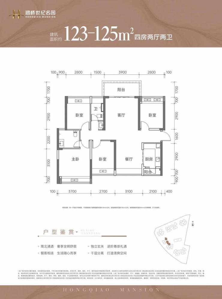 125㎡的4房2厅2卫,设计的是竖厅南北通透格局,客厅3.9米开间,LDKB一体化设计,4个卧室分别做到了主卧15.06㎡/次卧10.08㎡/次卧10.08㎡/次卧9.72㎡(包含墙体飘窗),L型厨房带1个小生活阳台,公卫三段式分离,得房率约75.7%(不含赠送),阳台主朝东北或东南向。