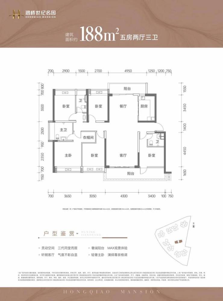 188㎡的5房2厅3卫,设计的是竖格局,南北通透双阳台,客厅4.3米开间,LDKB一体化设计,双主卧套间设计,5个卧室分别做到了主卧14.6㎡/套间9.22㎡/次卧13.2㎡/次卧12.18㎡/次卧11.34㎡(包含墙体飘窗),L型厨房带1个小生活阳台,公卫三段式分离,客厅阳台连接次卧出7.7米长的大阳台,得房率约73.5%(不含赠送),主朝正南向。