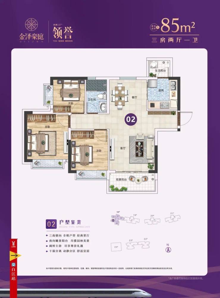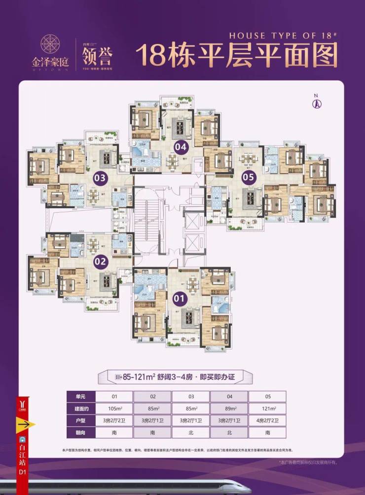 建面85-121㎡3-4房,首推18栋,约145套,85-89㎡三房两厅一卫、105㎡三房两厅两卫、121㎡四房两厅两卫。