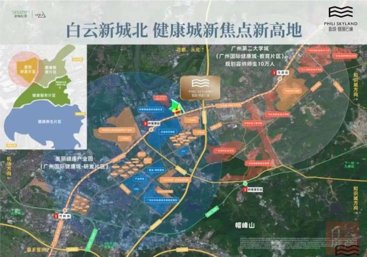 千亿级美丽健康城+白云大学城广州大健康产业基地,投资200亿,规模约等于22个广钢新城已有何济公、明兴制药、广药集团、和黄中药等29家知名健康产业企业入驻广州第二大学城,已有13所高等教育院校拥有仲恺农业工程学院、广东白云学院、广州软件学院、广州科技职业技术大学等本科大学为湾区打造科技人才