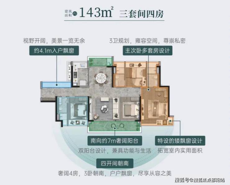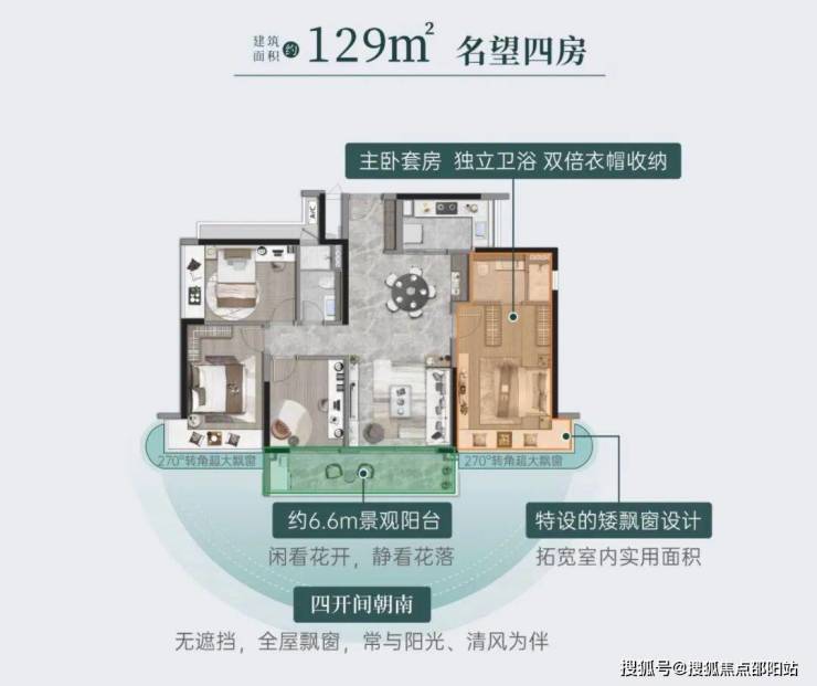 全屋四开间朝南,270 °三面采光,采光通风、舒适感倍增!客餐厅一体化设计,连通景观阳台,给你更多的空间、更舒适的享受。四间卧室分开布局,宽敞大气,让大家庭能创造更多生活场景。主卧带超大的转角衣帽间,独立卫浴、270 °的L形飘窗,让阳光随时充盈整个室内。