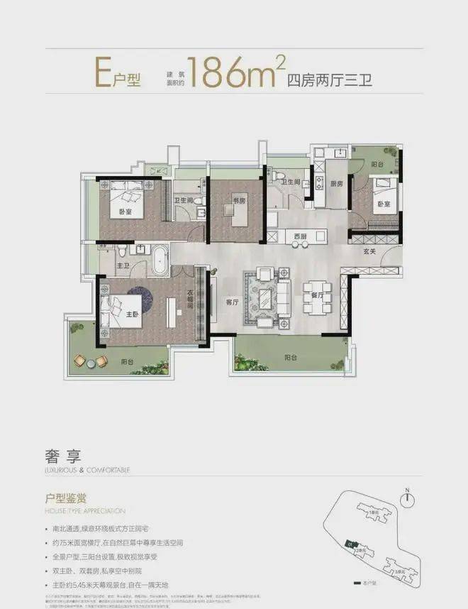 5. 186㎡户型,33套,大平层四房,豪华的居住体验,宽敞的客厅、独立的餐厅、精致的套房设计,尽显尊贵与舒适。
