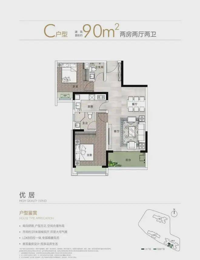 2. 90㎡以下户型,共170套,满足单身人士或新婚夫妇的刚需需求,空间布局合理,功能齐全。