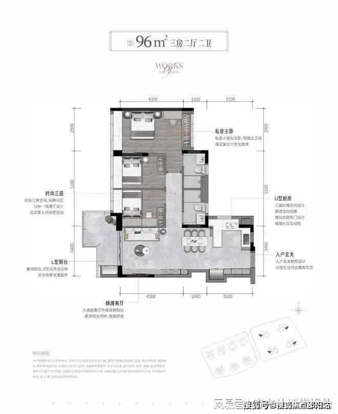 建面约94㎡的三房两厅两卫的产品共有两种户型。