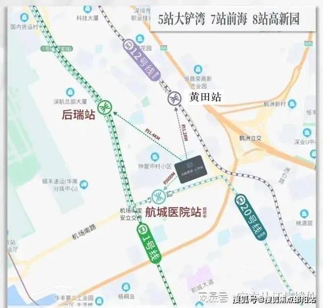 交通方面:项目距离规划中的20号线航城医院站约800米,在建的12号线黄田站约1200米,1号线后瑞站1200米,三铁汇聚。从项目出发,5站到大铲湾,5站到宝中,7站到前海湾,7站到深大,8站到高新园,非常便利。高速方面,沿江高速,京港澳高速,深岑高速(在建中),迅速通达南山福田及大湾区各城市。城市干道方面,宝安大道和107国道,联通深南和北环。城际铁路方面,深锚铁路,深大城际,穗莞深城际,城际枢纽核心。