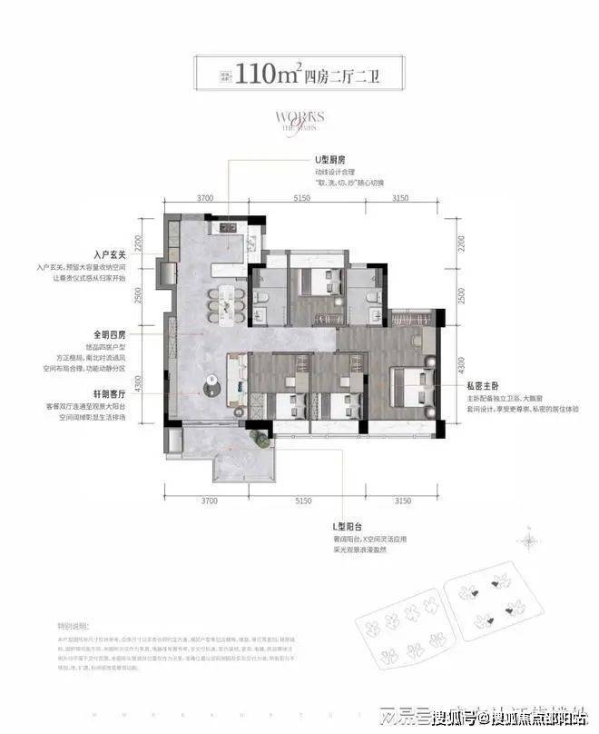 110㎡4房2卫,南北通,舒适4房。东南西南朝向,动静分区,四房空间配置。大面宽短进深,通风采光性能良好,主要生活空间光照充足。客厅带有L型多功能阳台,明亮舒适。主卧具有良好的开间进深比,空间宽敞舒适。次卧空间均衡,空间利用灵活。餐厨空间联系紧密,U型厨房实用性能高,入户预留配有收纳型玄关和冰箱位。