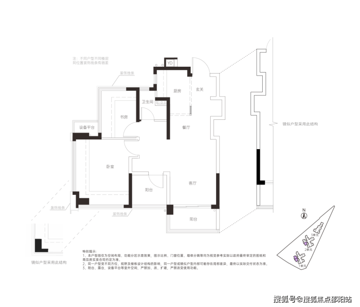 竖厅动静分区,S型墙内嵌冰箱位,“阳台”和“书房”处实际可以做房间。