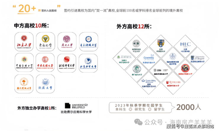 园区规划12.72平方公里,定位为国家级教育创新发展示范区。首创“大共享+小学院”理念,建立“留学海南=留学国外”品牌,目前已签约进驻23所国内外一流高校,未来将成为3万+国际高端人才的培养基地,也是自贸港核心人才孵化引擎。
